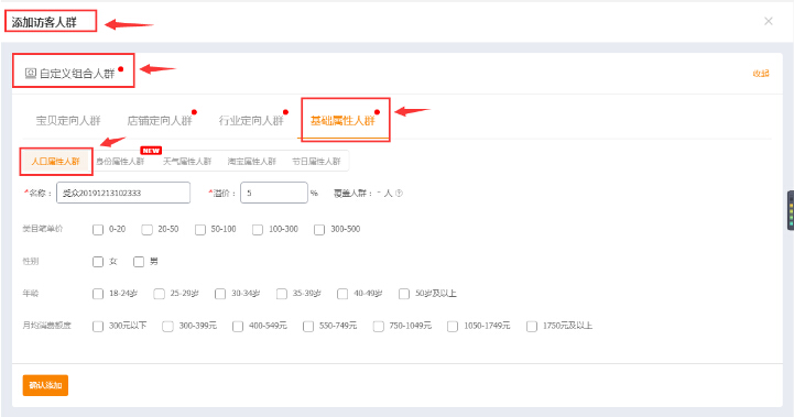 2.点击添加人群,我们可以看到自定义组合人群,里面有宝贝定向人群,店铺定向人群,行业定向人群,基础属性人群,而基础属性人群包括了人口属性人群,身份属性人群,天气属性人群,淘宝属性人群,节日属性人群,因为是测试店铺人群,所以我们注重在人口属性人群构建尽可能多的人群组进行测试