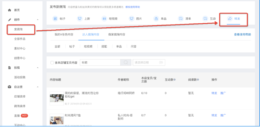 1、登录阿里创作平台(https://we.taobao.com/)在左侧栏“发微淘-转发”中,找到转发入口。