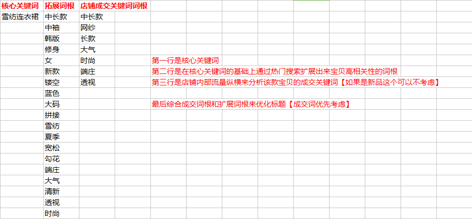 例如“蕾丝连衣裙 中长款”搜索出来的结果量级比较大,可以考虑在这个关键词的基础上进一步拓展。这样做的好处是,关键词成交之后权重会以词根累加。蕾丝+1 连衣裙+1 中长款+1 分别+1这样对于蕾丝连衣裙、中长款连衣裙、连衣裙这个三个关键词的搜索权重均会有提升。